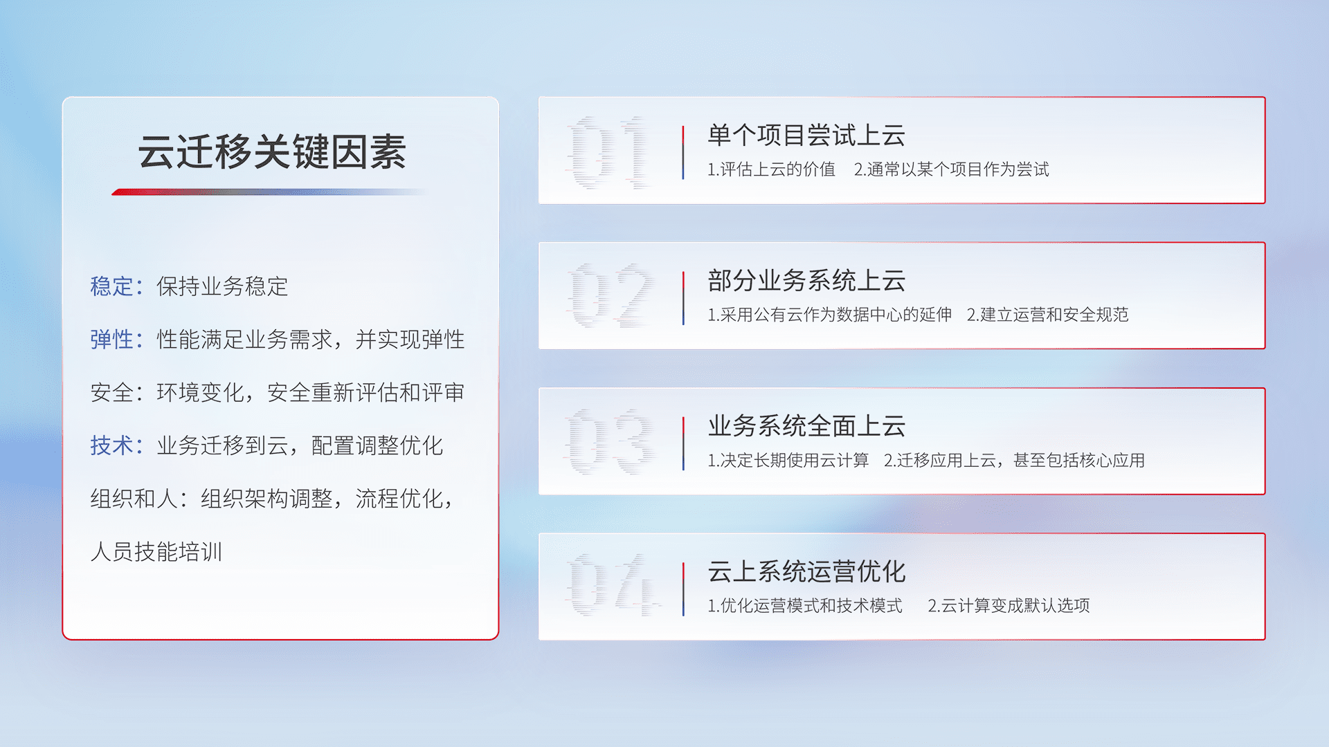 结合实际业务,,,,从规划设计、、云平台选型、、云原生改造、、、数据迁移、、、集成交付,,,,迁移全过程为客户识别最佳上云路径,,,,做好风险识别管理,,设计网络架构、、、、身份权限、、安全审计合规、、操作审计、、日志审计、、、、监控告警策略、、多站点容灾设计等,,,,对云上基础设施进行整体规划,,提升IT治理水平,,,以满足弹性、、、高可用、、高性能的需求。。